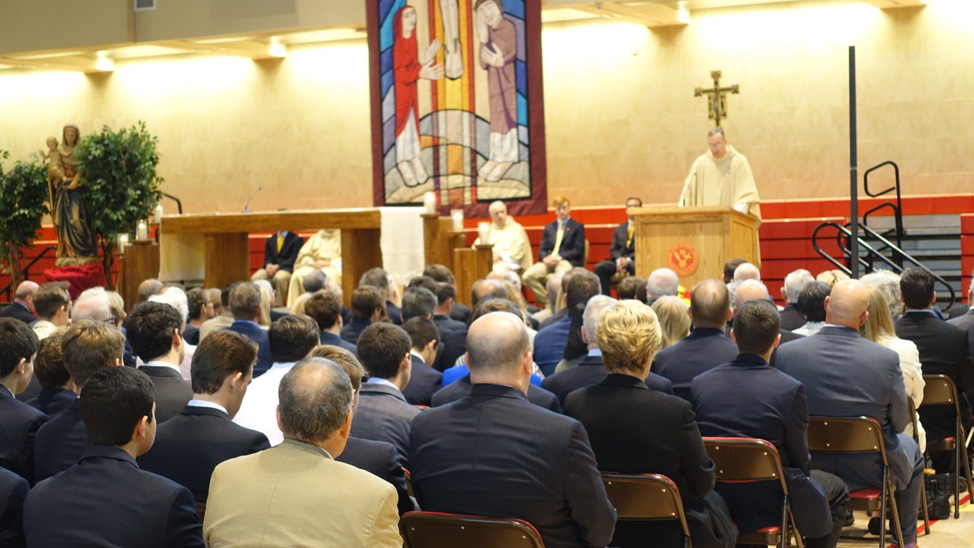The Gospel passage he read was from Mark 10:35-45. In the passages, the apostles James and John were talking with Jesus. Jesus asked them, “What do you want me to do for you?” Both answered, “To sit at your right or left, or to be with you in heaven.” Jesus told the apostles that they must first serve others if they desire to sit at His side. Fr. Timothy connected this reading to his homily about service, sacrifice, and honor by opening with several important examples. He reflected on Father Chaminade’s life and the lives of three specific Gold Star alumni, Sgt. James J. Regan ’98, Lt. Ronald D. Winchester ’97 and Michael LiCalzi ’00, to exemplify this message. All of these men exhibited the qualities of service, sacrifice, and honor.