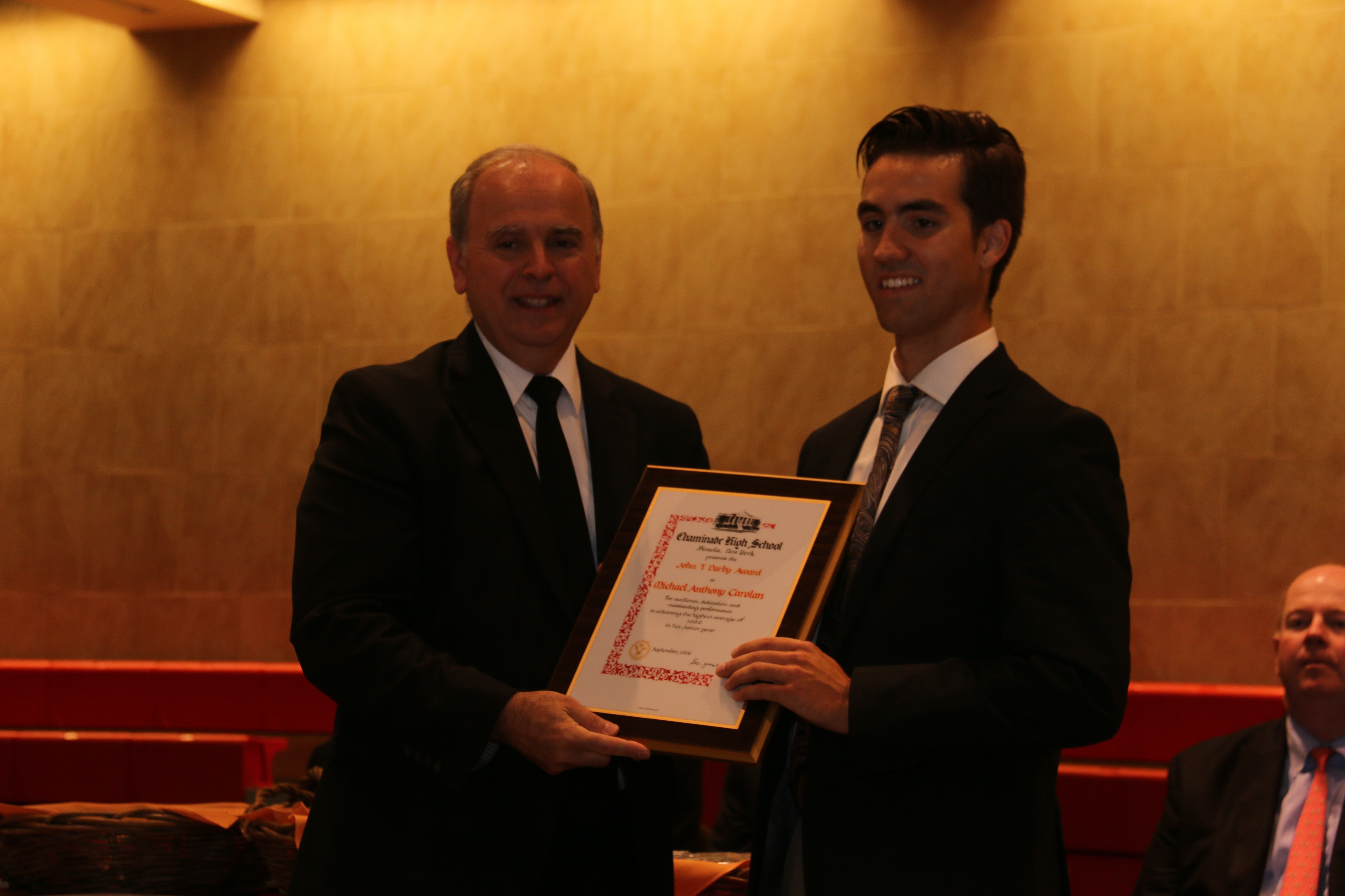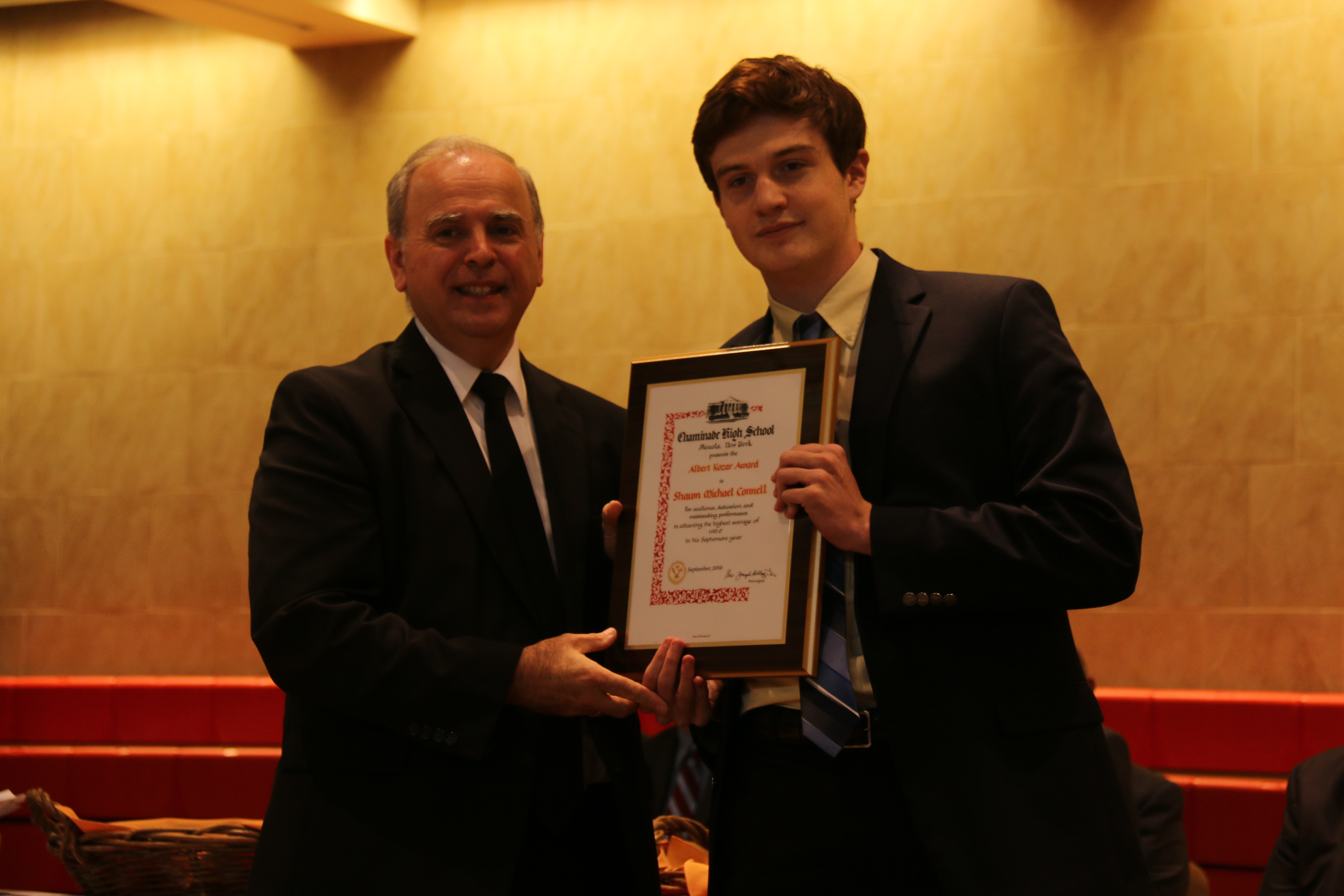 This year’s ceremony began with members of the Gold Band performing “Prince of Denmark” as the Chaminade student body entered the AAC. The first awards were given to each individual who had achieved the highest average in his respective class, beginning with the class of 2017 and concluding with the class of 2019. Michael Carolan ’17, recipient of the John T. Darby award for highest average of the junior division and the Thomas J. Power award for highest three-year cumulative average, recalled the lessons he learned from his achievement. “Succeeding isn’t always about being perfect,” Carolan pointed out. “The most important thing is to keep a positive outlook on things and success will follow.” Additionally, the Albert Kozar award for the highest ranked sophomore went to Shawn Connell ’18; the Louis T. Faerber award for last year’s highest ranked freshman went to Daniel Garcia ’19.