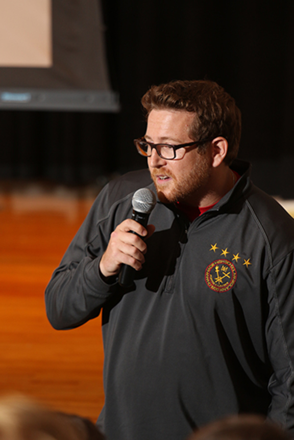Mr. Michael Dolce ’99 was up next. His talk with the Flyers was centered on his spiritual life during college. He discussed how his relationship with God decreased rapidly after graduating from Chaminade and how God led him back to his faith. Mr. Dolce would eventually become a football coach and religion teacher at Chaminade. His story conveyed the idea that when we are lost, God will help us find our path. All students with red candles were asked to place them on the tower for those who struggle with their spiritual life.