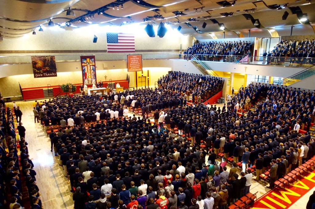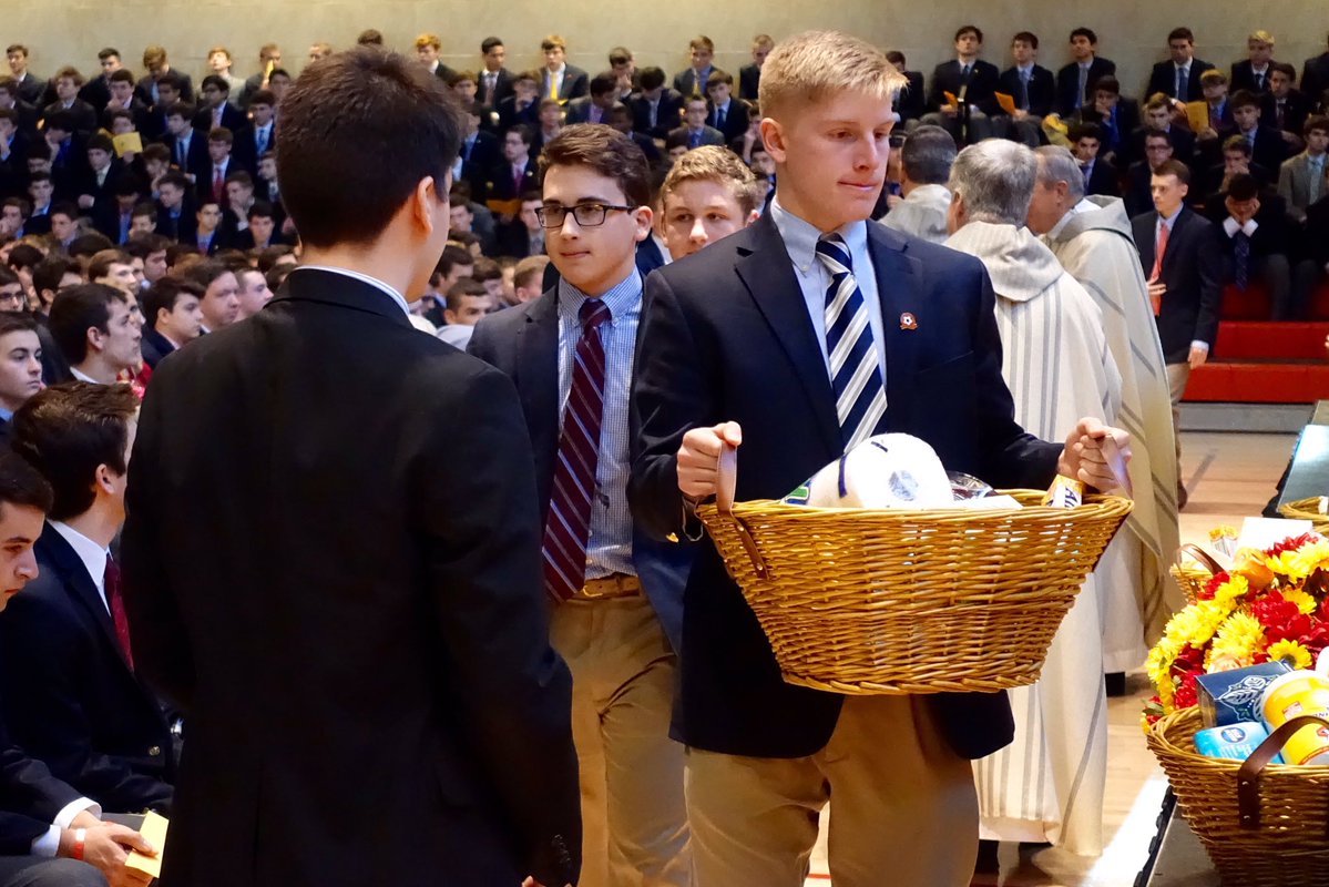 On Wednesday, Srs. Maria Catherine and Gabrielle, L.S.P., three residents from the nursing home, and many college-age graduates of Chaminade gathered with the student body to celebrate Mass. The celebration was led by Fr. Joseph Davanzo, the pastor of Christ the King in Commack. Those who made up the congregation were united by their faith and expressed great appreciation for all God has provided for them. Representatives from each homeroom and members of the cross country team carried the baskets of donations to the altar following Fr. Joe’s homily. At the end of the Mass, Sr. Maria Catherine thanked everyone for their generous donations on behalf of the Little Sisters, pointing out that “these small gifts help us a great deal.”