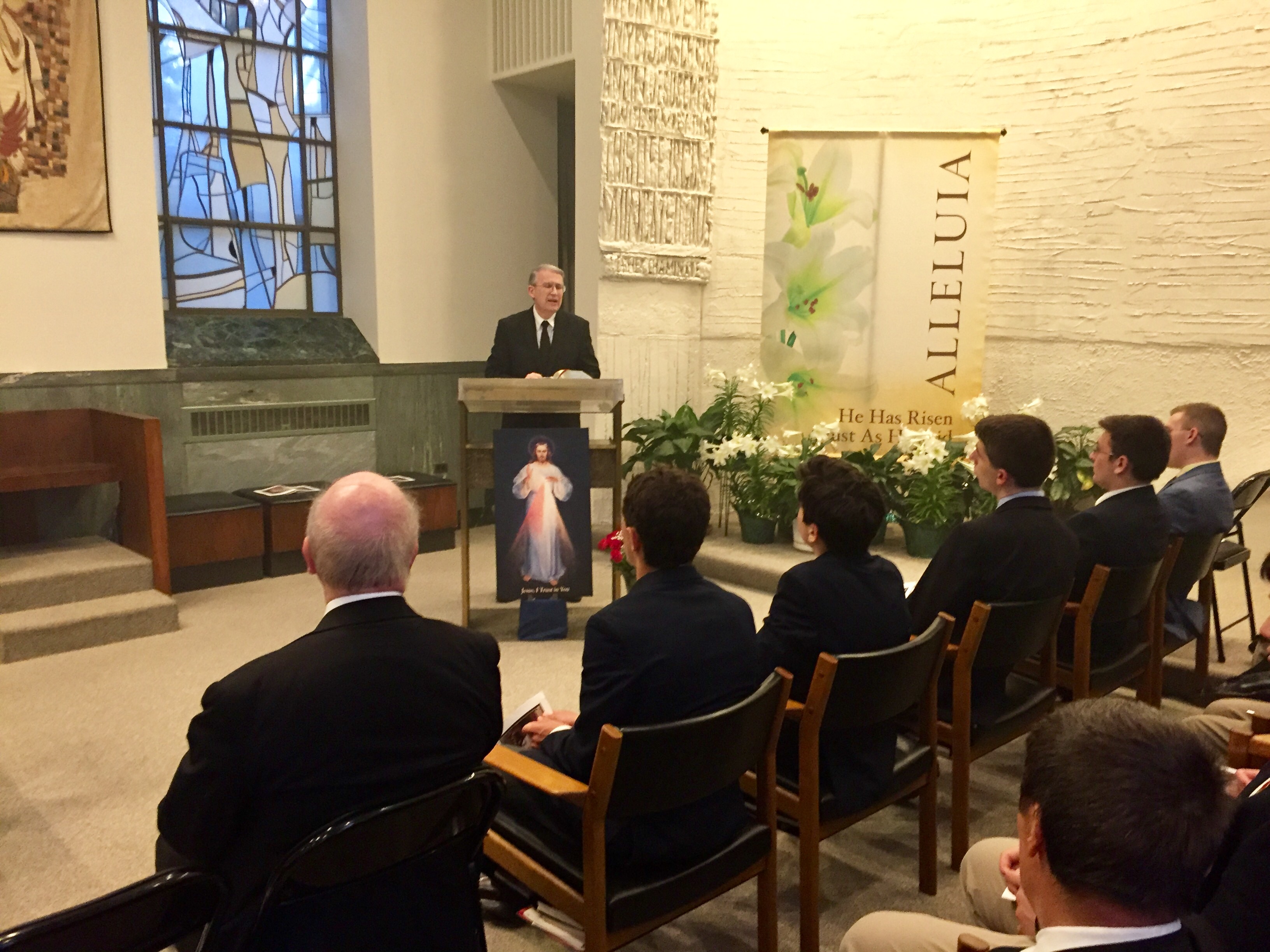 Bro. Steve then passed the baton onto Bro. Rob Lahey S.M. and Bro. Andrew Santoriello, n.S.M. ’07, who led the congregation in the singing of “Here I am to Worship,” before Fr. Garrett Long, S.M. ’62 exposed the Eucharist. After brief quiet prayer, Bro. Rob and Bro. Andrew began evening prayer by the singing the psalms. The singing of the psalms gave a unique spiritual experience to the students while also showing them how the brothers pray every day. After the singing of three psalms, Bro. Benjamin Knapp, S.M. ’93 stood up and read a reading from St. Paul’s second letter to Timothy. This reading is famous for its line where St. Paul declares that he has “run the race”, a phrase later to be used by the night’s speaker.