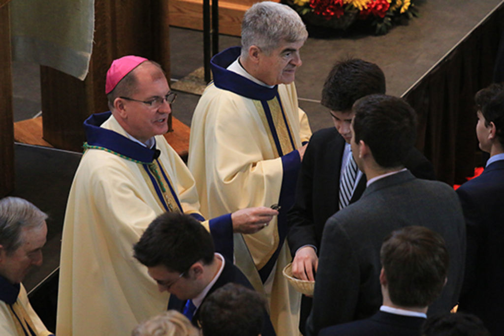 In the first three months of his episcopate, Bishop John Barres has been tirelessly reaching out to the young people of our diocese. Recognizing the youth as a cornerstone to the present and future evangelization of the Church, he has visited schools, attended sporting events, and addressed students all across Long Island. This past Friday the bishop made his first appearance in front of our student body, celebrating Mass alongside Marianist priests and then meeting with Flyers all over Chaminade.