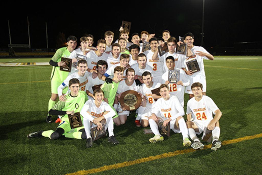 Great teams find a way to win the games that matter most, and this year’s Chaminade varsity soccer team certainly did just that on Saturday night, clawing their way to a 1-0 triumph over the St. Anthony’s Friars in the N.S.C.H.S.A.A. Finals. It was questionable as to how this young team would respond to a big-game environment, but playing in front of a packed student section at Motamed Field on the campus of Adelphi University, the Flyers turned in arguably their best performance of the season. The Crimson and Gold played physical and determined against their the Friars, feeding off the energy from the crowd to help propel them to victory. As usual with these rivals, the game resembled a heavyweight fight, with both teams trading scoring opportunities until Chaminade finally delivered a knockout punch in the second half.