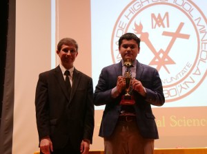 Later in the evening, awards were presented to students in each category. Jack Viscuso was awarded with Best in Freshman Biology, Colin Ruggeberg won Best in Sophomore Biology, and James Messina was awarded with Best in Junior Chemistry. Finally, the judges picked sophomore Nicholas Sathi, who studied the impact of light on Drosophila melanogaster reproduction, for Best in Show.