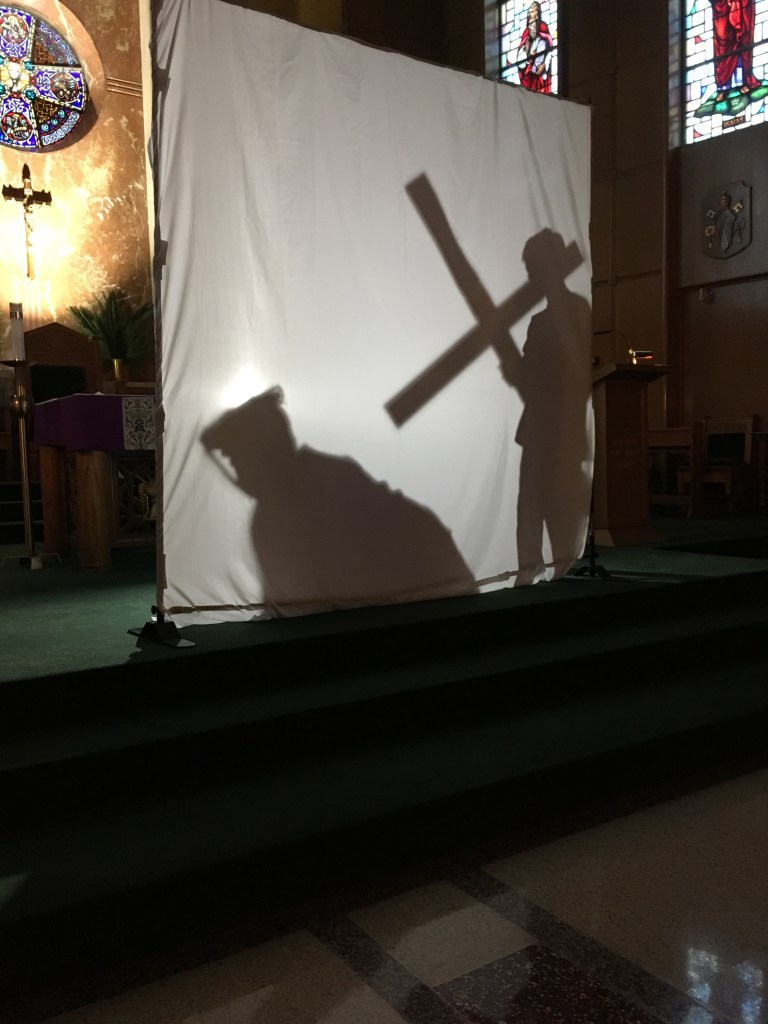 The event, which was unlike anything the community of St. Thomas had seen before, featured silhouette depictions of the 14 major steps in Christ’s walk to Calvary and other special effects. Actors stood behind a white screen in such a way that only their shadows would appear visible as they represented our Lord and the other figures in His story. Practically speaking, this was an efficient way to magnify each station for a larger crowd, but it also lent an exciting twist to the conventional practice.