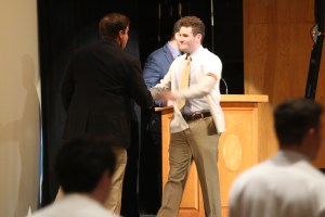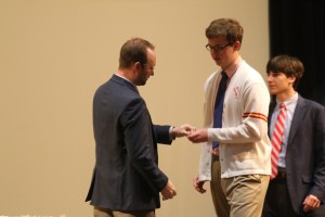 Mr. Kevin Beirne ‘00 was the next coach onstage, and he applauded this year’s cross country team. After giving the freshman MVP award to Owen Sweeney ‘22, he spoke about the sophomore’s hard work that helped propel them to a third-place finish in the CHSAA. Following his speech, he named Frank Naudus ‘21 the sophomore MVP. Mr. Beirne proceeded to honor the varsity squad, which placed 5th in the league and qualified for the NY State Federation Championship. Finally, he presented Jack Curley ‘19 with the MIP/Lt. Licalzi Award, and Brendan McGrath ‘19 with the MVP award.