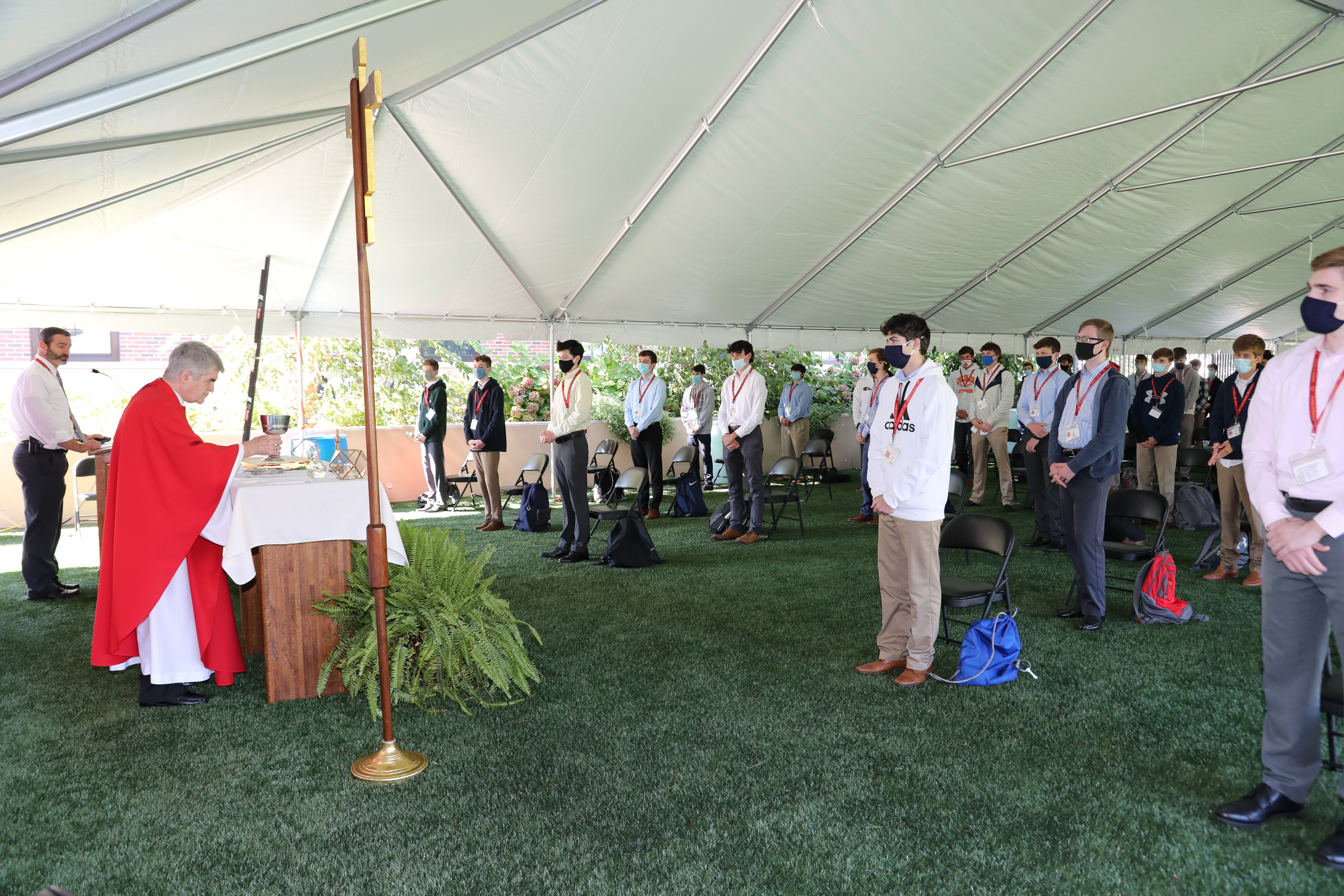 Since inviting students back to the campus for the first time since March, Chaminade has made it a focus to maintain faith. Over the course of two weeks of school, the Campus Ministry team and Production Crew have organized outdoor Masses for students to attend during their study hall periods. Pulling off 20 assemblies in such a short period of time was no easy feat, but the flexibility of the administration created a successful event for students and faculty. Each Mass hosted a couple classes from the same division in a socially distanced seating arrangement under a tent on Farber Field. Students were granted the gift to celebrate the sacrifice of our Lord in each other’s presence, and it was a great kickoff to our school year.