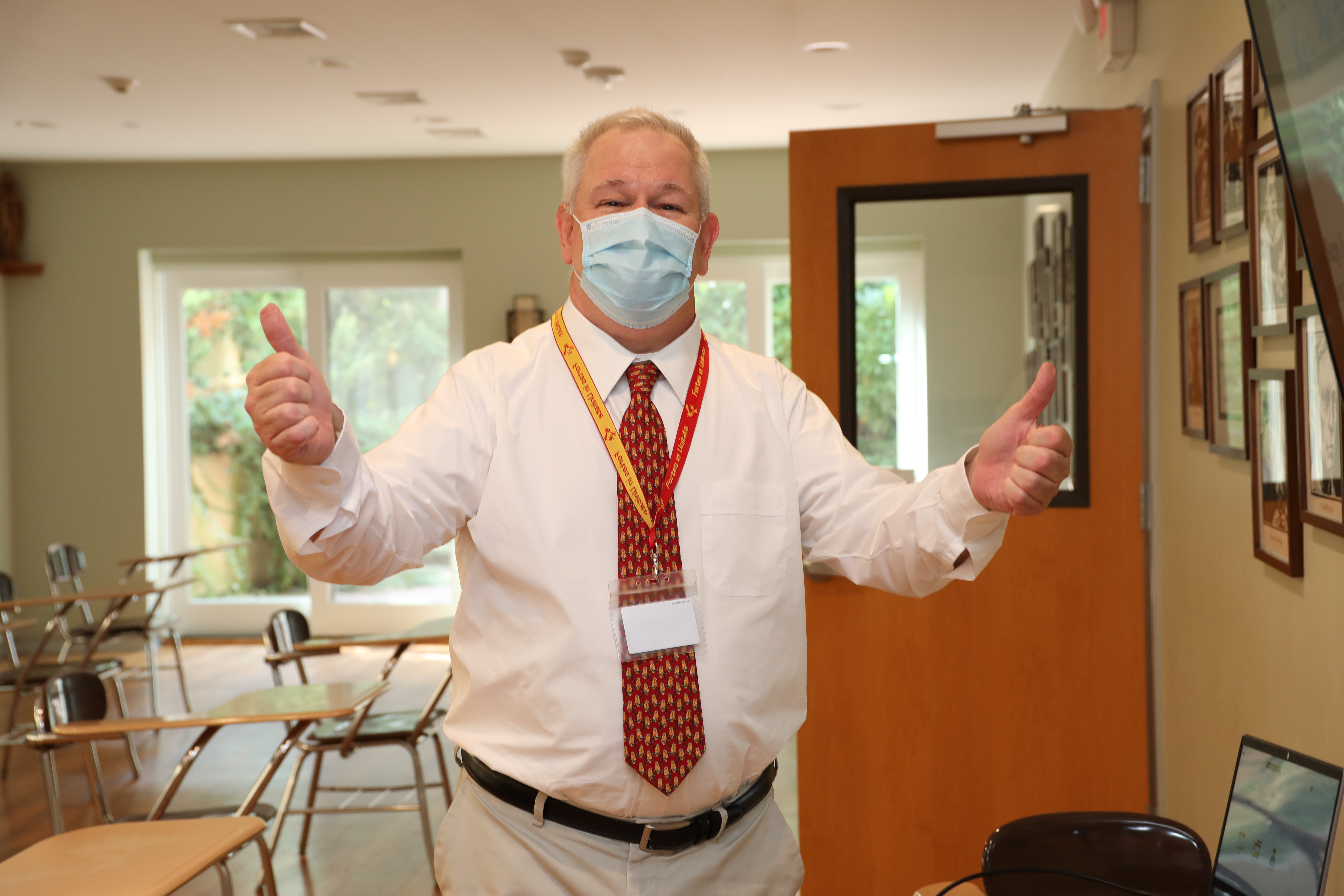 In accordance with directives from local and state officials, all persons present on the Chaminade campus are instructed to wear facial coverings and maintain social distancing. To this end, Chaminade’s student body of 1,700 was divided by year into three main locations on campus: the main building, the Dolan Family Science, Technology, and Research Center, and the Activity-Athletic Center. To provide an introductory experience to Chaminade that resembled some semblance of normal, the freshman and sophomore classes occupy the main building and attend in-person classes the entire day. For juniors and seniors, each grade has been divided into two sections – Crimson and Gold – that attend live classes in three core subjects in either the morning or afternoon and complete asynchronous assignments in the other three subjects daily. Yet, the development of this unique schedule was the result of the assistant principal office’s tireless dedication and a two day experimentation of the schedule.
