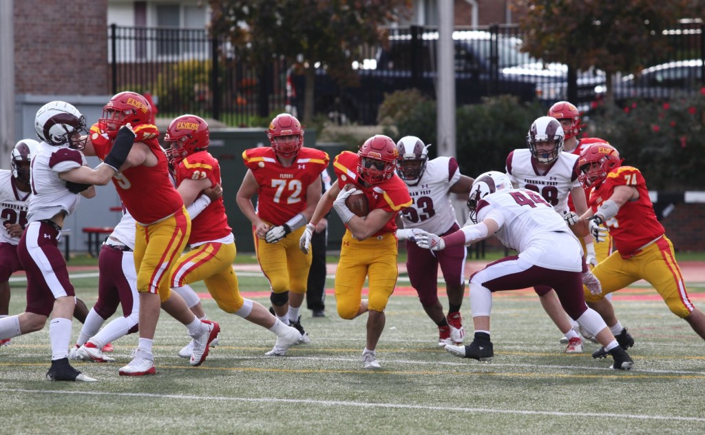 After wrapping up the regular season, winning three of their last four games, the Flyers varsity football team finished the 2021 regular season with a 5-3 overall record. This year, one of the Flyers’ most significant assets was their rushing attack, led by senior running back Christian Alacqua ‘22, arguably one of the best players in the Catholic AAA league. In just 8 games, Alacqua rushed for over 1000 yards and 15 touchdowns, most among all other offensive players. Alacqua helped contribute to crucial wins over St. Peter’s and St. Francis Prep, tallying 347 rushing yards and 6 touchdowns over both contests. In addition to the Flyers’ rushing attack, senior wide receiver Michael Miller ‘22 and junior wide receiver Gavin Creo ‘23 helped the team in the passing game when they needed it. Miller registered 3 touchdowns, while Creo registered 4 touchdowns during the regular season and helped lead the Flyers’ to victories over Monsignor Farrell and Fordham Prep.