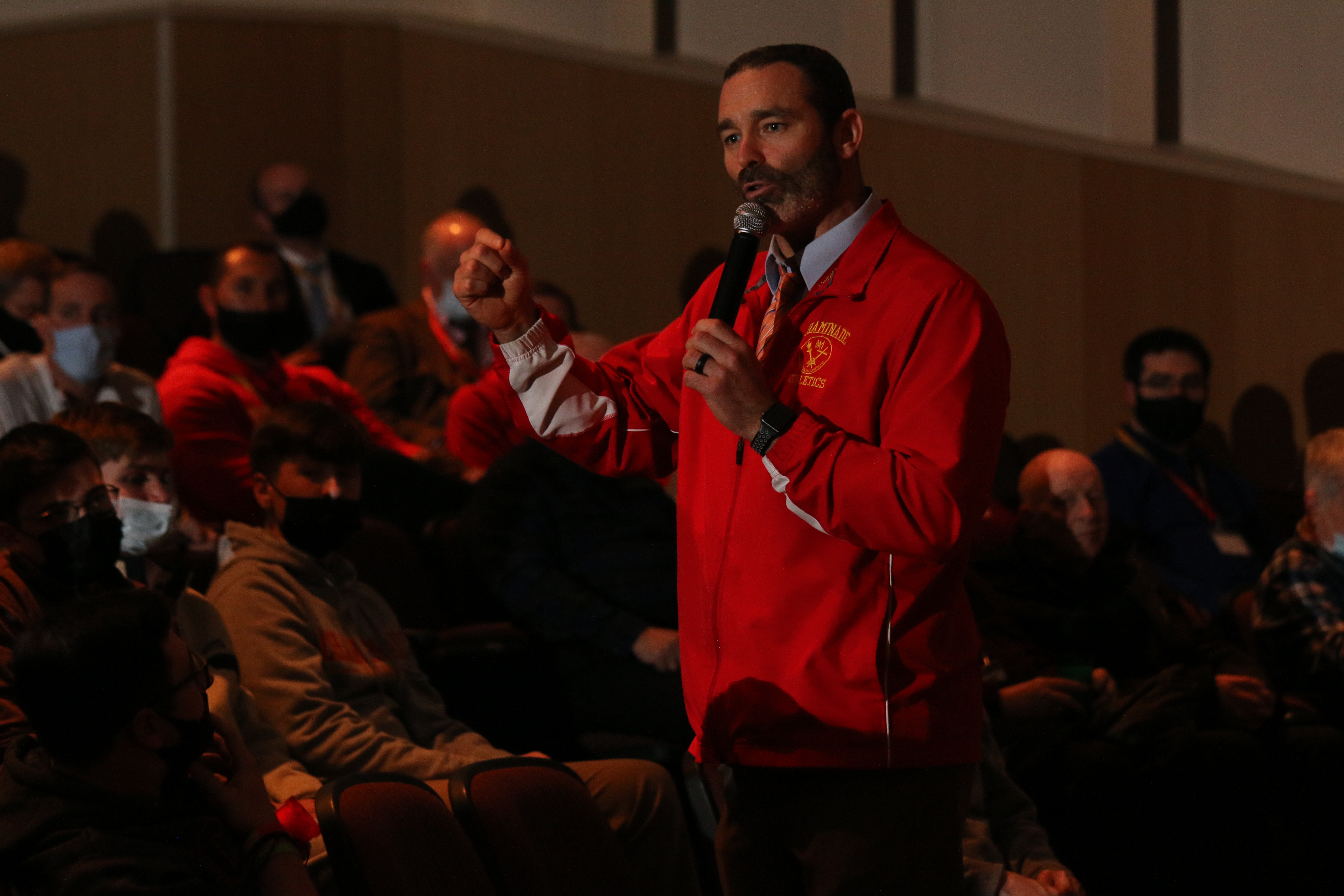 Following the BBQ dinner, attendees were led by Mr. Foley ’93 into the Hearst Auditorium. Mr. Foley began the evening by explaining that God wanted everyone there for a reason, that there was something God wanted to communicate with us, and that we should be open and listen to God’s message this evening. Students selected a colored candle and took their seats, awaiting the presentation of faith talks. The evening’s first speaker was Mr. Gregory Saporita ‘02, who shared a personal experience about a beloved surfing coach named John. Mr. Saporita described a difficult time at home. He enjoyed spending time with John and his wife, who often invited him to stay for dinner. A highlight of the friendship was when John gave Mr. Saporita his surfboard as a gift — an item Mr. Saporita still uses and cherishes to this day. Unfortunately, John sadly and unexpectedly passed away about a year later, which caused Mr. Saporita great sadness.. Mr. Saporita then went on to discuss his more recent friendship with a 90-year-old neighbor. At first, the fellowship was limited to watching Sunday Giants football games at the neighbor’s home, each enjoying their own reclining chair. Then the elderly neighbor began to give lists to Mr. Saporita for items he needed at the grocery store. This caused frustration for Mr. Saporita, who was busy with his own family and young children. Mr. Saporita sought guidance from Mr. Chicavich ‘98, who encouraged him to pray on the situation and pray for the neighbor in need. While on that phone call, Mr. Saporita looked out his home window and saw two rainbows — a rare event — but one that he saw as a sign. Perhaps the surf coach and friend John’s example of helping Mr. Saporita when he was in need impacted Mr. Saporita to help his elderly neighbor by providing him companionship.