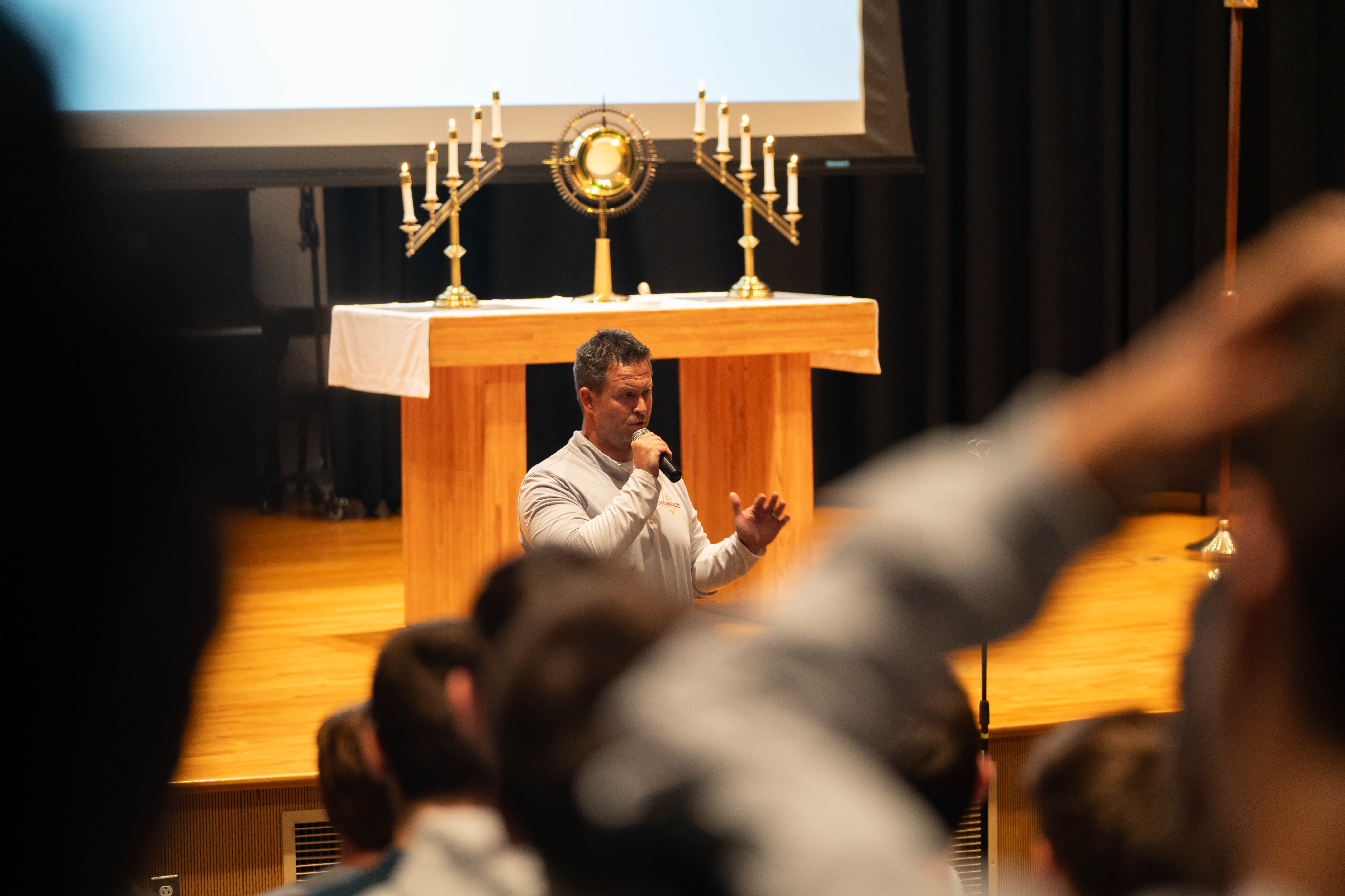 After everybody was (finally) finished eating, the students and teachers moved to Hearst Auditorium to be in the presence of the Eucharistic Jesus and to listen to a testimony from Mr. Matthew Chicavich ‘98. Although the details of the narrative will be spared for the sake of any readers who may attend HUNGER in the future, it was a moving and powerful story that affirmed the fundamental truth that God is real and active in our lives, even when we struggle to see it. The speech drew immense emotion from the audience, and everybody who heard it had their perspective changed on life, even if just for a moment. As the students knelt before the Eucharist, received a blessing, and then took a cookie while leaving the AAC, there was a distinct feeling of content among them, their physical and spiritual hunger having been nourished.