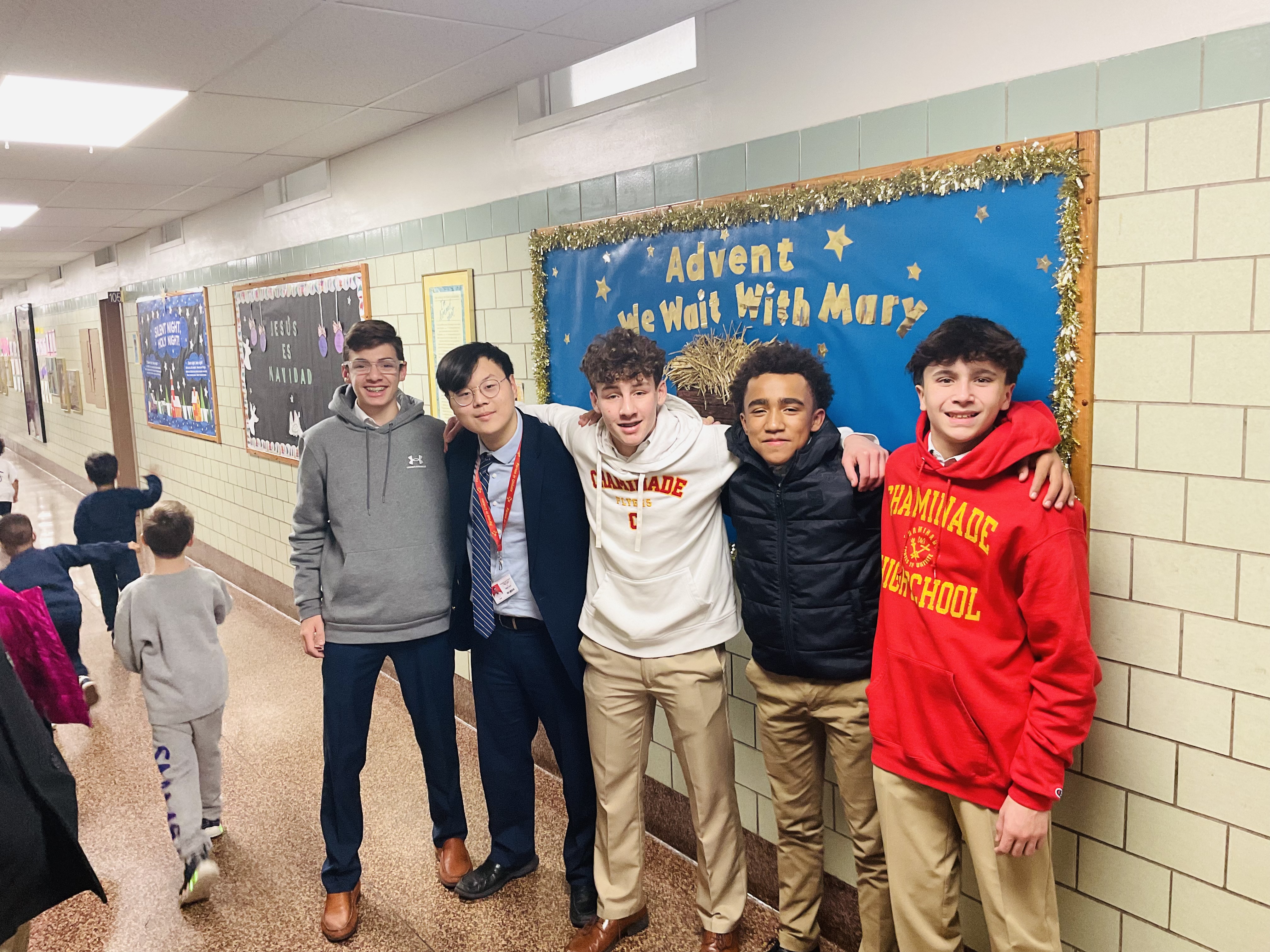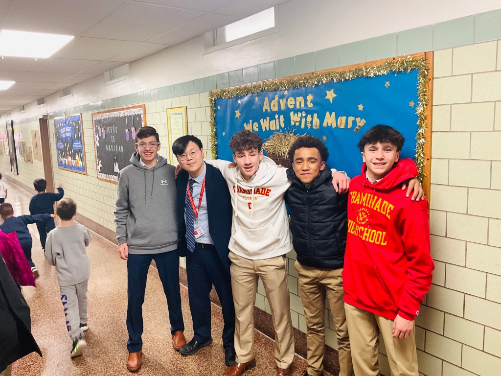 Five Chaminade freshmen traveled to the St. Martin de Porres Marianist School in Uniondale to spend time with some of the youngest members of the school’s afterschool program. Aiden Park, Nicholas Tsimis, Dylan Schroeder, Shaye Sykes, and A.J. Zilinek were selected to conduct story time, which involved reading children’s Christmas books and helping students complete coloring pages and a craft. The freshmen “auditioned” for this role by being the most expressive and enthusiastic readers when completing a public speaking assignment in their English classes.