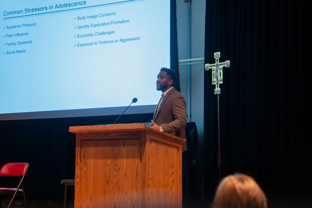 Faith in Chaminade also plays a role in well-being, and Dr. Fisher reinforced the mind-spirit-body connection. Ms. Hafner reminded students that all humans are created in God’s image, meaning that every person we encounter has an inherent dignity that we must recognize and uphold. In addition to seeing others in this light, according to Ms. Hafner, we should also recognize this value in ourselves.
